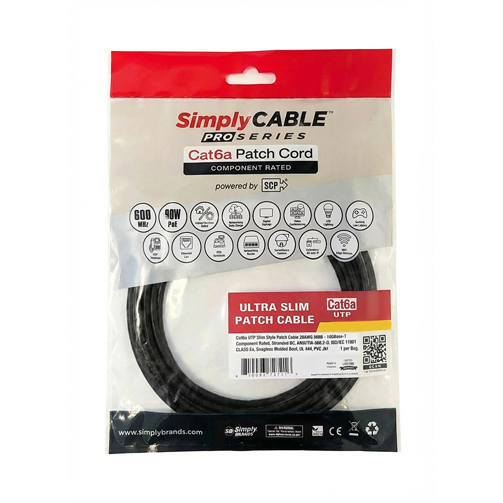 1ft/0.3m – Cat6a UTP Slim Style Patch Cable 28AWG 568B – 10GBase-T Component Rated- Stranded BC, ANSI/TIA-568.2-D, ISO/IEC 11801 CLASS Ea, Snagless Molded Boot, UL CM, PVC Jkt- Black, 1ea/Bag
