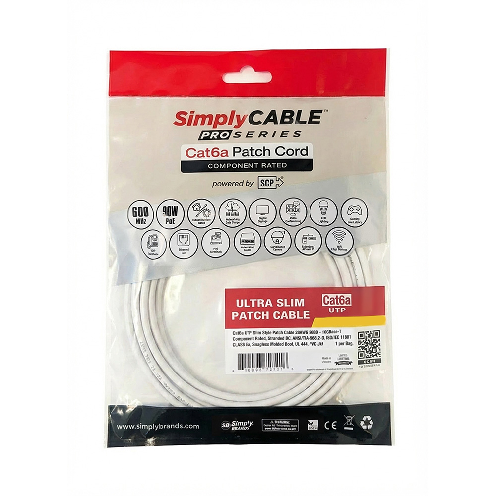 SC-PC1701SLWT – 1ft/0.3m – Cat6a UTP Slim Style Patch Cable 28AWG 568B – White, 1ea/Bag
