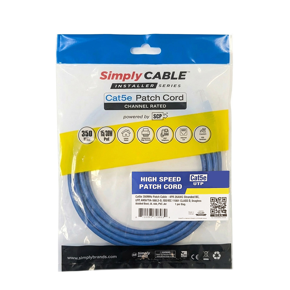 SC-PC2500BL – 6IN/25cm – CAT5E 350 MHz PATCH CABLE- 4PR 26 AWG, CHANNEL RATED, STRANDED BC, UTP, ANSI/TIA-568-C.2, ISO/IEC11801 CLASS D, SNAGLESS/MOLDED BOOT, UL CM, PVC JKT- BLUE- 1EA/BAG