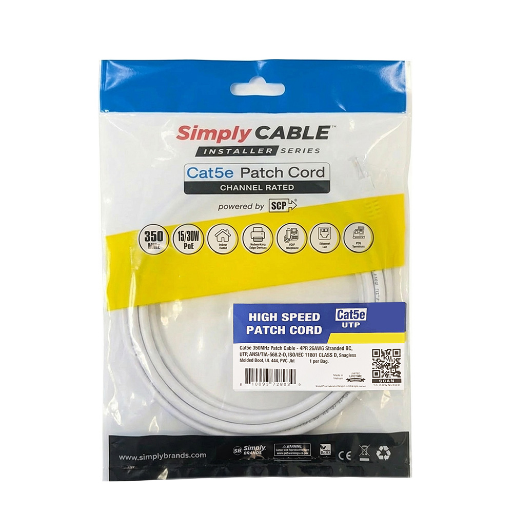 SC-PC2500WT – 6IN/25cm – CAT5E 350 MHz PATCH CABLE- 4PR 26 AWG, CHANNEL RATED, STRANDED BC, UTP, ANSI/TIA-568-C.2, ISO/IEC11801 CLASS D, SNAGLESS/MOLDED BOOT, UL CM, PVC JKT- WHITE- 1EA/BAG
