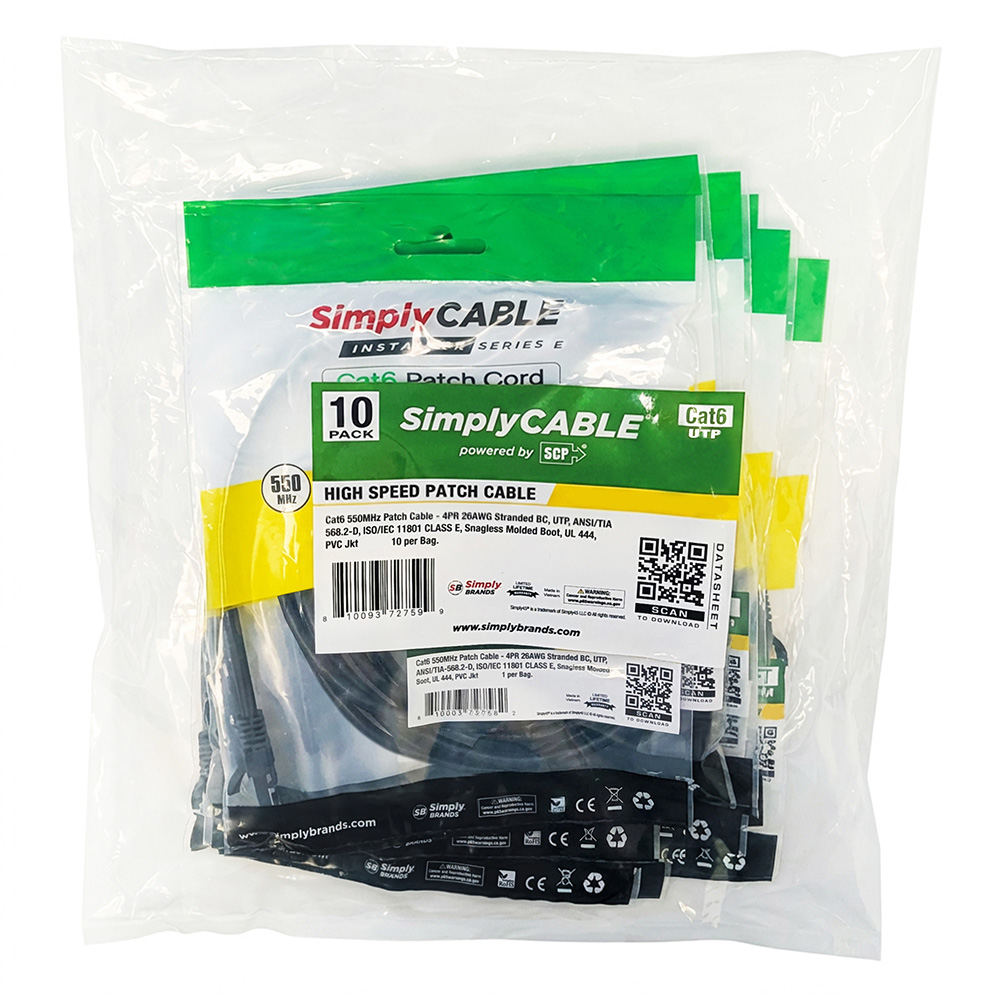 SC-PC2600BK-10 – 6IN/30cm – CAT6 550 MHz PATCH CABLE- 4PR 26 AWG, CHANNEL RATED, STRANDED BC, UTP, ANSI/TIA-568-C.2, ISO/IEC11801 CLASS E, SNAG-LESS/MOLDED BOOT, UL CM, PVC JKT- BLACK- 1EA/BAG-10pc Pack