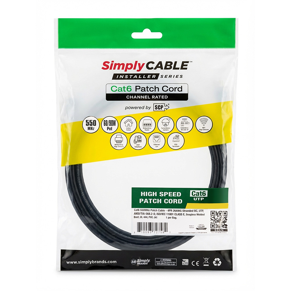 SC-PC2600BK – 6IN/30cm – CAT6 550 MHz PATCH CABLE- 4PR 26 AWG, CHANNEL RATED, STRANDED BC, UTP, ANSI/TIA-568-C.2, ISO/IEC11801 CLASS E, SNAG-LESS/MOLDED BOOT, UL CM, PVC JKT- BLACK- 1EA/BAG
