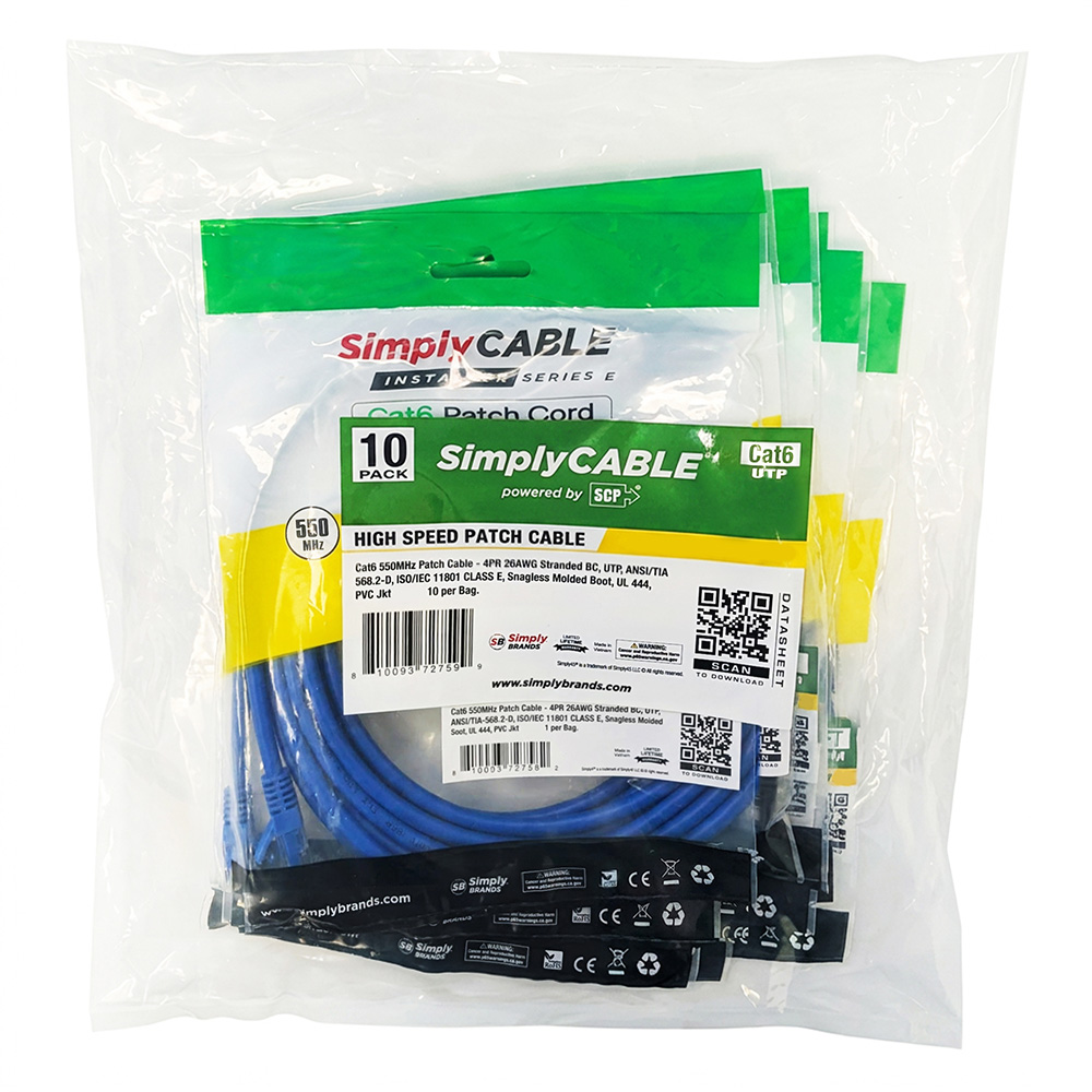 SC-PC2600BL-10 – 6IN/30cm – CAT6 550 MHz PATCH CABLE- 4PR 26 AWG, CHANNEL RATED, STRANDED BC, UTP, ANSI/TIA-568-C.2, ISO/IEC11801 CLASS E, SNAG-LESS/MOLDED BOOT, UL CM, PVC JKT- BLUE- 1EA/BAG-10pc Pack