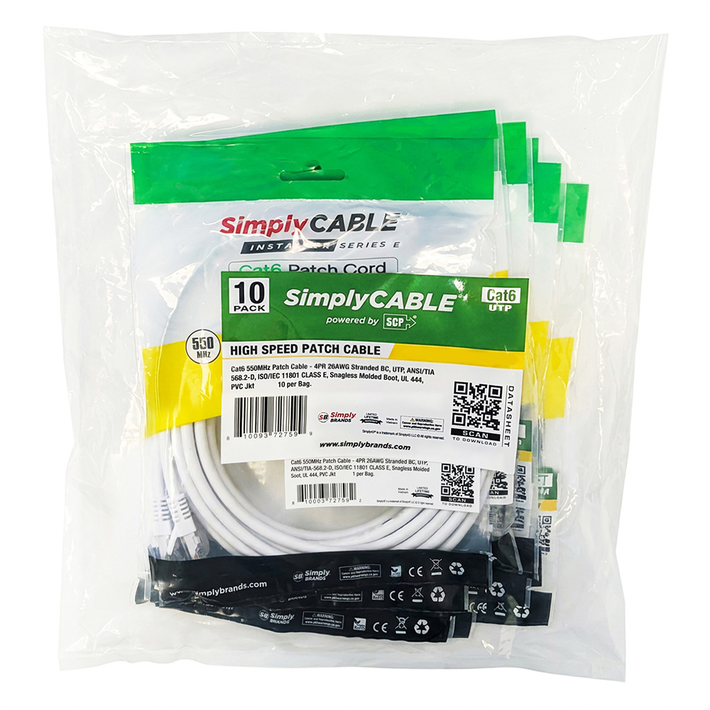 SC-PC2600WT-10 – 6IN/30cm – CAT6 550 MHz PATCH CABLE- 4PR 26 AWG, CHANNEL RATED, STRANDED BC, UTP, ANSI/TIA-568-C.2, ISO/IEC11801 CLASS E, SNAG-LESS/MOLDED BOOT, UL CM, PVC JKT- WHITE- 1EA/BAG-10pc Pack