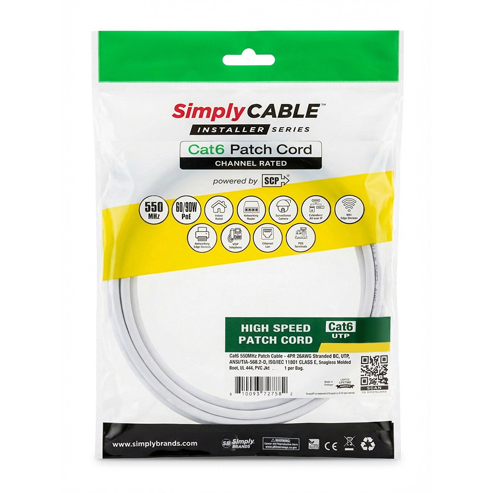 SC-PC2600WT – 6IN/30cm – CAT6 550 MHz PATCH CABLE- 4PR 26 AWG, CHANNEL RATED, STRANDED BC, UTP, ANSI/TIA-568-C.2, ISO/IEC11801 CLASS E, SNAG-LESS/MOLDED BOOT, UL CM, PVC JKT- WHITE- 1EA/BAG