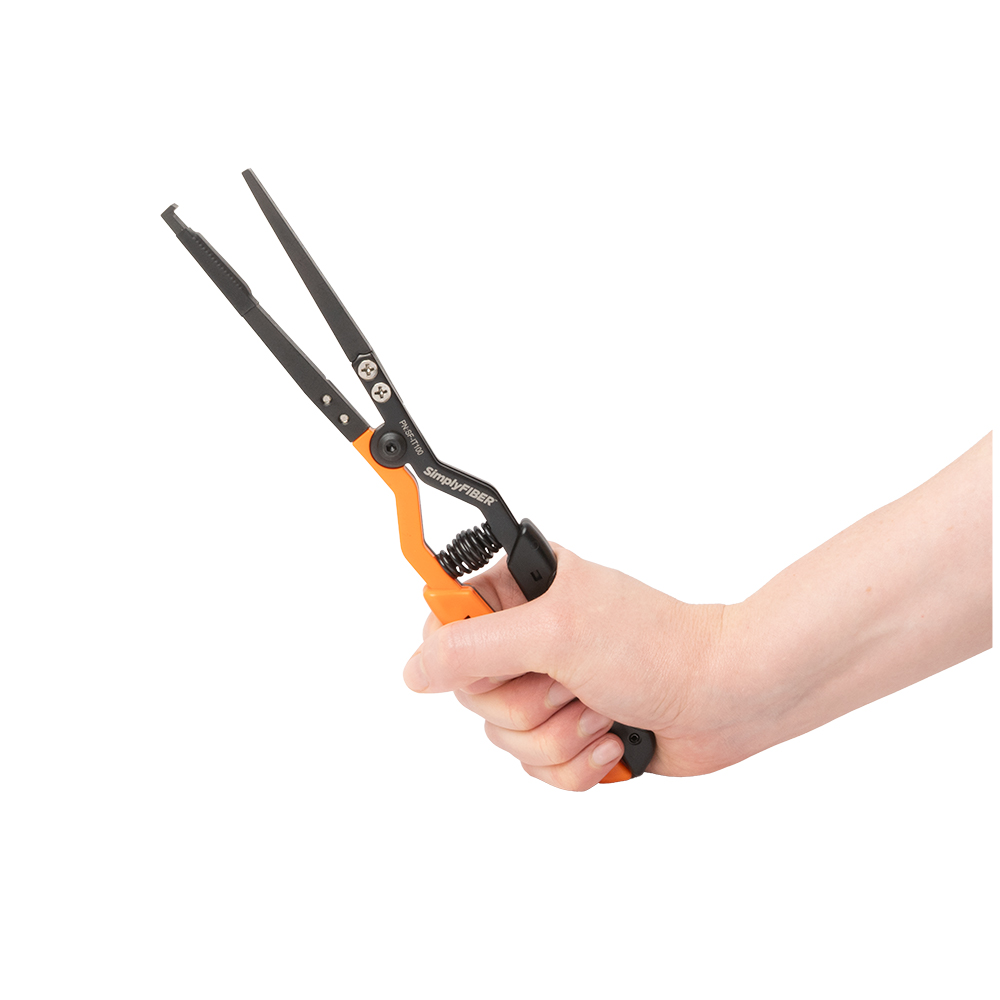 The SimplyFIBER™ SF-IT100 is designed to easily insert and remove SC, LC, MU, & MTRJ simplex and duplex connectors into high-density patch panels. The bent nose tip features a rubber pad to securely grip the connectors without causing damage or disturbing adjacent cables. The sprint-loaded handle is ergonomically designed with an over-molded handle that provides maximum control and comfort.